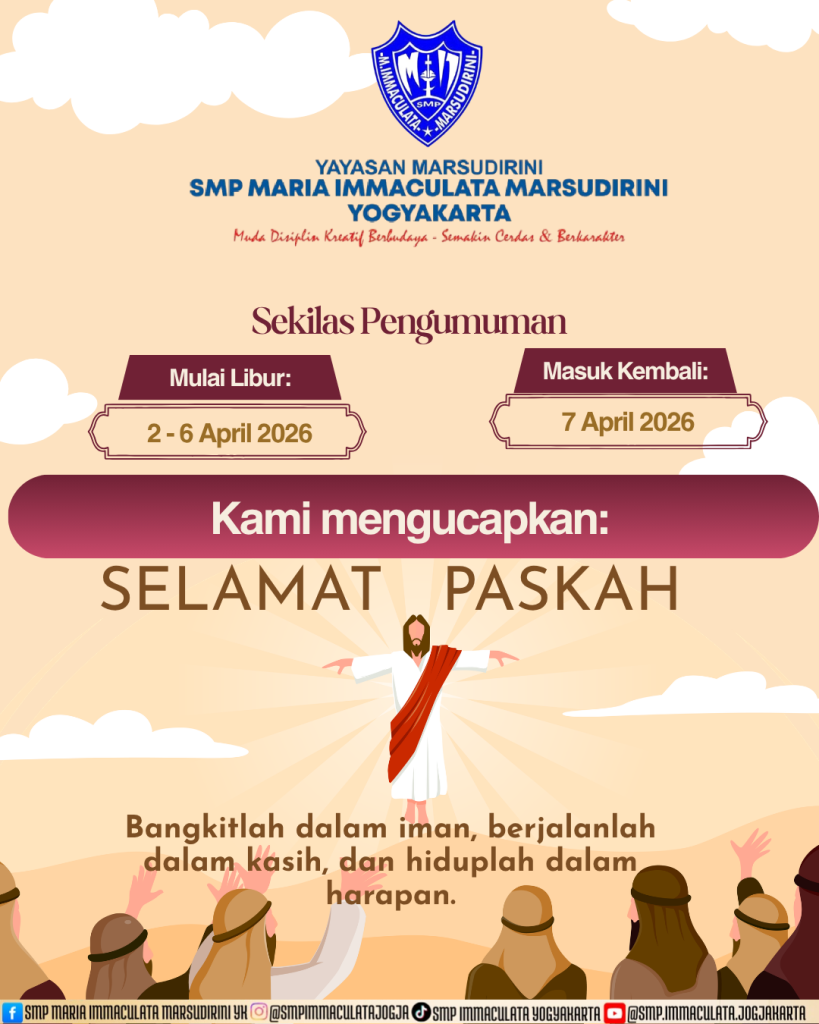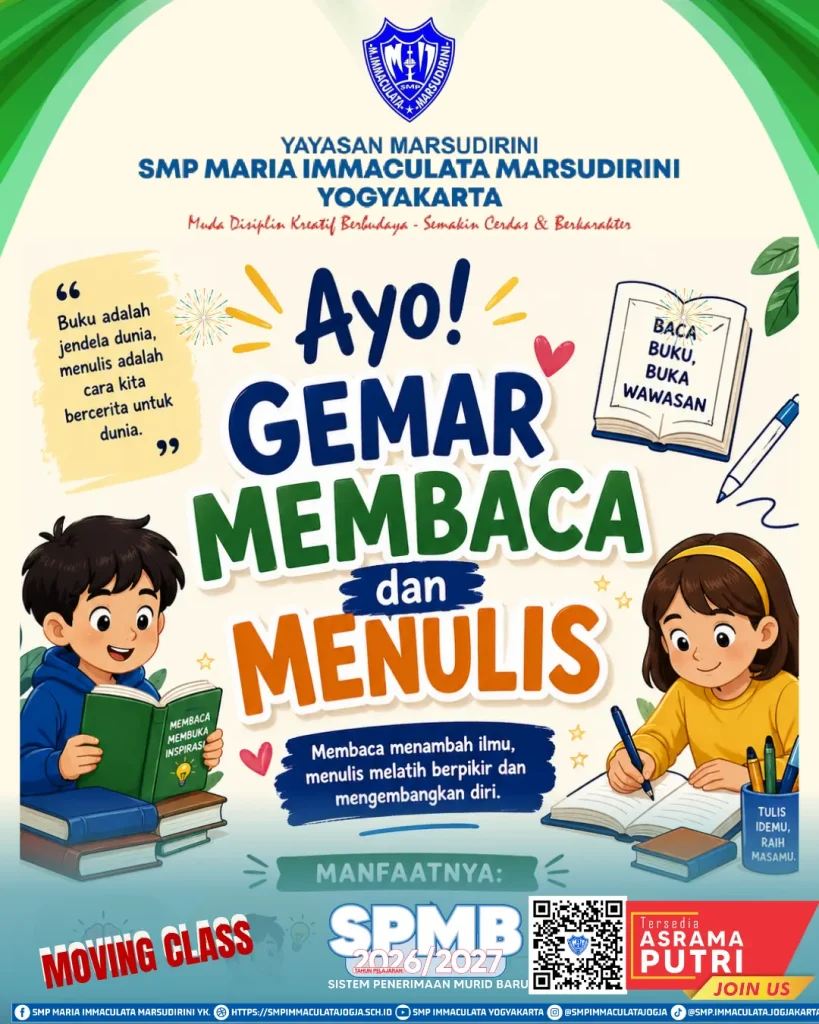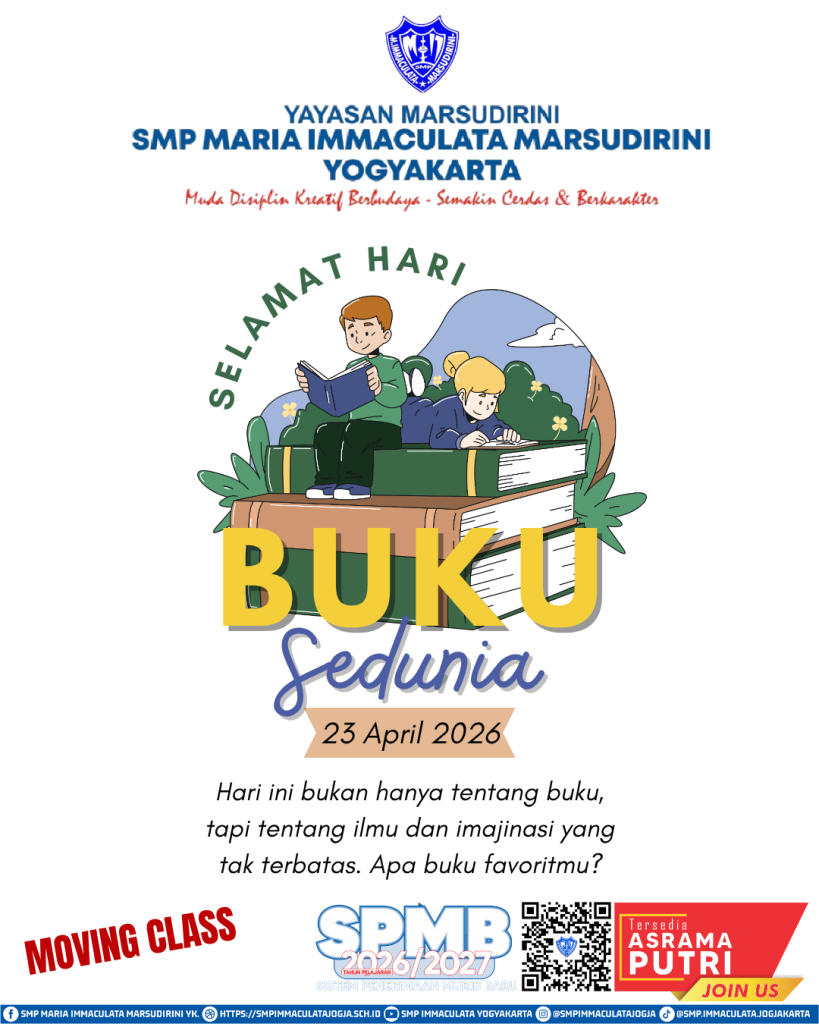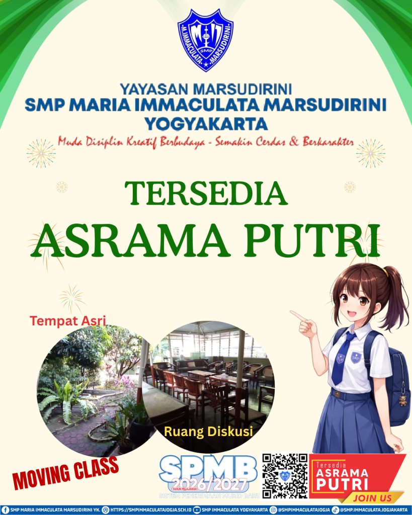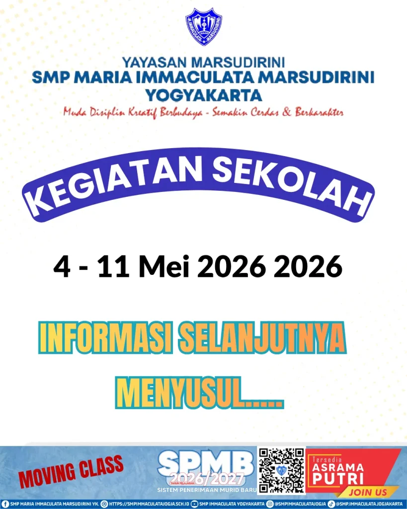 Jika Anda mencari sekolah yang tidak hanya mengembangkan kecerdasan, tetapi juga membentuk karakter dan kepekaan budaya, inilah tempatnya. Mari bergabung dan menjadi bagian dari keluarga besar SMP Maria Immaculata Marsudirini Yogyakarta, tempat generasi muda tumbuh menjadi pribadi yang disiplin, kreatif, dan berbudaya.